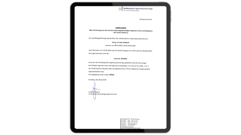 Christin Goldbeck ist nun als beratende Ingenieurin und bauvorlageberechtigte Ingenieurin in der Hamburgischen Ingenieurkammer-Bau eingetragen