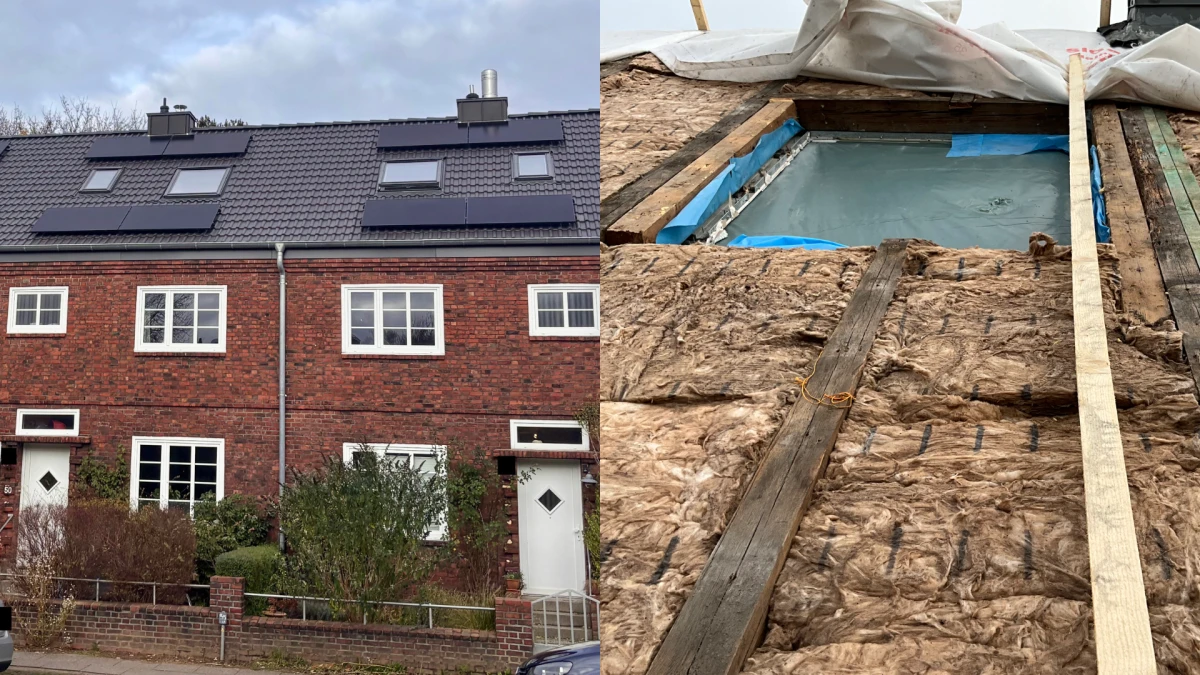 Vier zusammenhängende Reihenhäuser in Hamburg aus dem Jahr 1928 standen vor der nächsten energetischen Entscheidung. Wie wird das Dach sinnvoll saniert? Dieses Praxisbeispiel zeigt, wie Strategie, Energieeffizienz, Förderung und Bauphysik zusammenwirken.